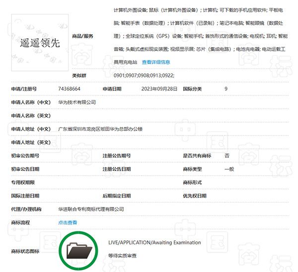 2023年9月28日,華為技術(shù)有限公司向國(guó)家局提交了一件商標(biāo)的申請(qǐng)請(qǐng)求,商標(biāo)字樣就是“遙遙領(lǐng)先”。