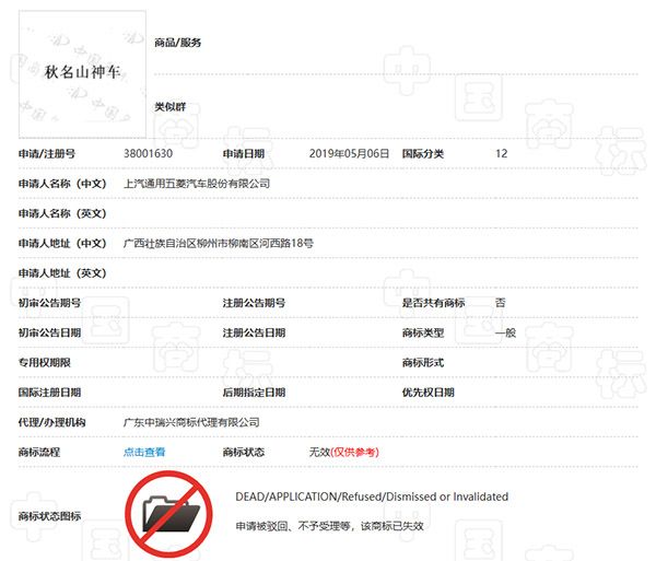五菱汽車就因?yàn)?ldquo;秋名山神車”的網(wǎng)絡(luò)梗,嘗試注冊(cè)“秋名山神車”商標(biāo)。但商標(biāo)狀態(tài)顯示已經(jīng)駁回。雖然不知道具體的駁回原因,但從未見過五菱在官方的正式產(chǎn)品或廣告中使用“秋名山神車”與商品相關(guān)聯(lián)。